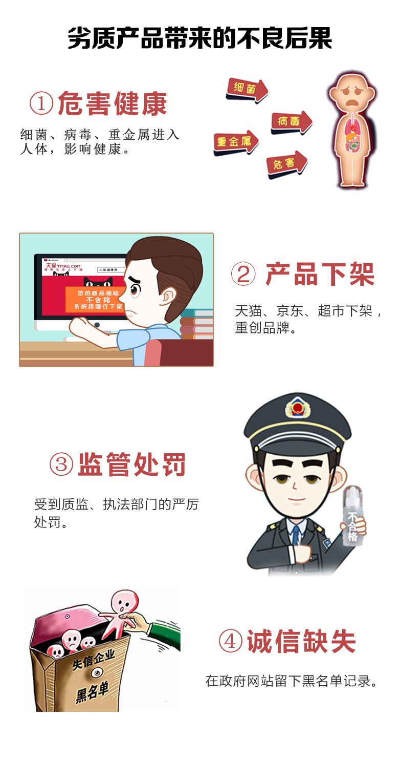 嚴(yán)謹(jǐn)出精品!嚴(yán)格按照GMP生產(chǎn)規(guī)范!生產(chǎn)前原材料檢測,確保原料合格。生產(chǎn)中半成品檢測,確保生產(chǎn)過程無污染。生產(chǎn)后產(chǎn)品檢測并且出具出廠檢測報告,確保產(chǎn)品符合標(biāo)準(zhǔn),從原料到成品層層把關(guān),確保每一件均為精品。不怕被質(zhì)監(jiān)部門、電商平臺抽檢!