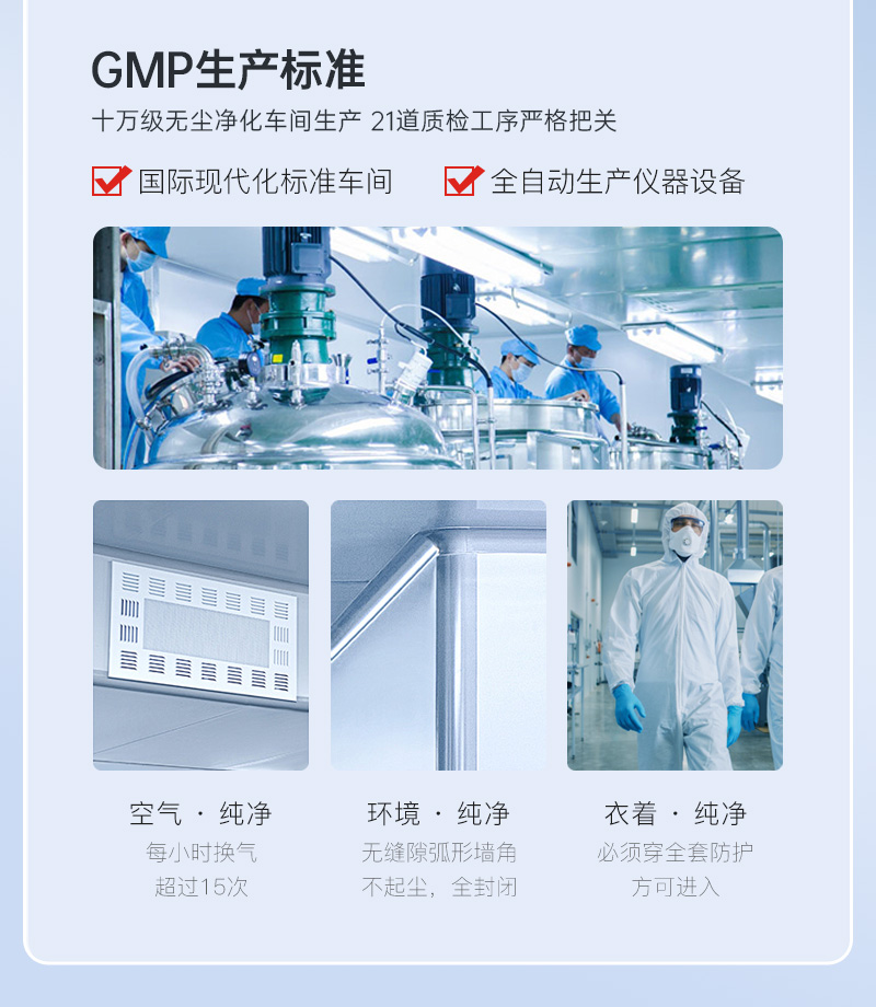 嚴格按照GMP生產規(guī)范!生產前原材料檢測,確保原料合格。生產中半成品檢測,確保生產過程無污染。生產后產品檢測并且出具出廠檢測報告,確保產品符合標準,從原料到成品層層把關,確保每一件均為精品。200ml大容量,1瓶頂2瓶!